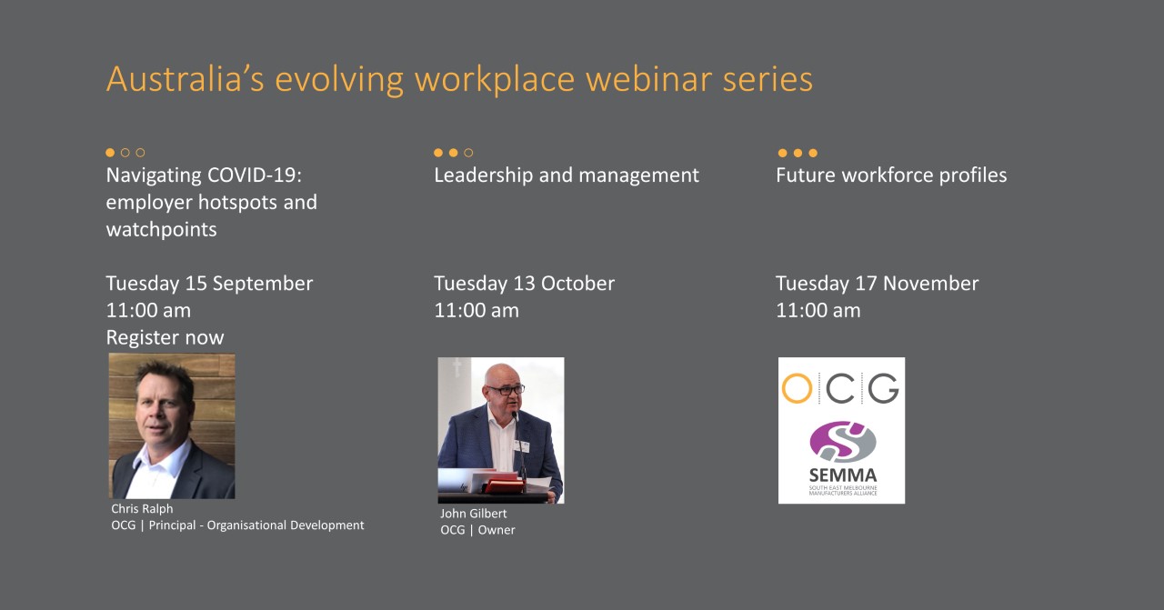 Online via ZoomThe topics covered in this webinar include: 1. How to decrease WorkCover premiums 2. Malingers - what can be done? 3. What have we learned about Workplace Health and Safety from the COVID pandemic? 4. The annual flu vaccine - should you offer it? 5. A word on mental health claims Delivered by SEMMA Member Atticus…