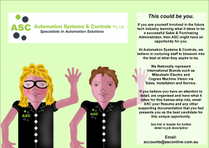 Automation Systems & Controls in Bayswater are hiring. Sales and Purchasing Administrator POSITION DESCRIPTION Answering Incoming Calls Actioning emails Attending to Counter Sales and Enquiries Processing Customer Purchase Orders Supporting Component sales from a Technical perspective Organising deliveries Ordering parts and liaising with Suppliers Working with Accounting Packages…